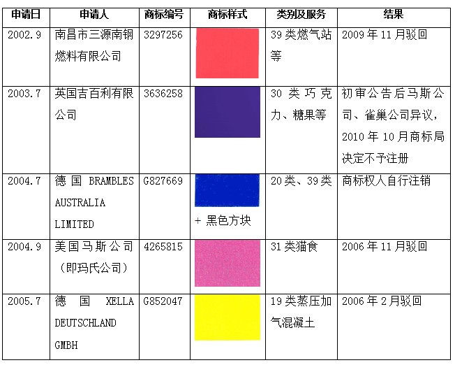 我国现有的商标法将单一颜色排除在被列举的可予注册标志的范围之外。作为成文法国家,由于没有明确的法律授权,商标审查机关在实践中实际上排除了单一颜色作为商标注册的可能性。我国拥有世界上第二大商标注册簿,但至今尚无一例单一颜色申请获准注册。如下图所示,自2002年起就至少有5件单一颜色商标注册申请,首次提出单一颜色申请的并非外国企业而是江西南昌某石油化工企业;但除了英国吉百利有限公司的注册申请曾被初审公告、但随后由于他人异议决定不予注册之外,对于其他单一颜色的注册申请,商标局均是直接予以驳回。